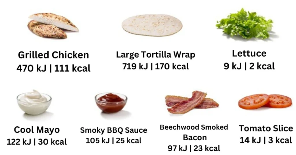 BBQ & the Bacon Chicken One Crispy Wrap contains about 2067 KJ of energy. If you convert it to calories, it becomes 493 kcal. This amount of energy is enough for an adult, making up about 25% of the daily food intake.
